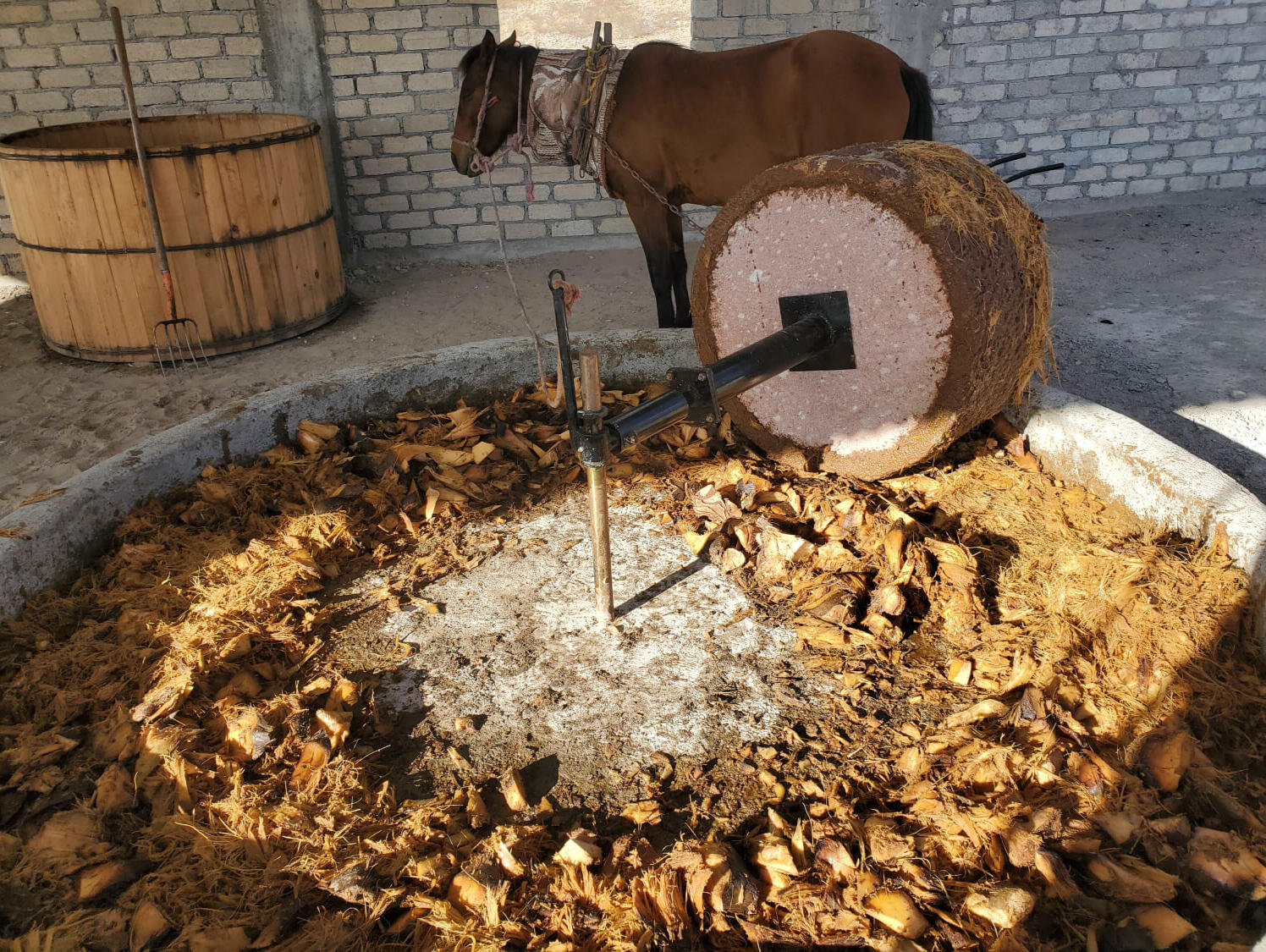 Las piñas cocidas son partidas en pedazos mas pequeños y colocadas en el molino circular.La fuerza animal es aprovechada para mover una pesada piedra, que aplasta el maguey cocido contra las “muelas” al girar. Las “muelas”, son piedras colocadas en la base del molino a modo de pastel, contra las que choca la tahona. Esta acción da como resultado una pulpa suave y exprimida que facilita el siguiente proceso: la fermentación.