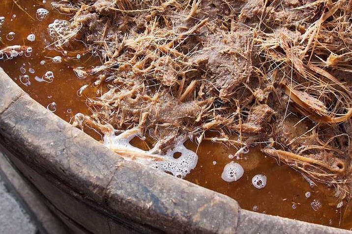 Posteriormente la pulpa machucada es depositada en tinas de madera, usualmente pino o roble donde se le agrega agua caliente para hidratar el producto y acelerar el proceso. Esta agua es la base del tepache.La tina se cubre y se deja reposar aproximadamente dos días para que se fermente. Es en esta parte del proceso donde los azucares naturales de la planta son transformados en alcohol. Una vez pasados dos días; se agrega agua fría, se remueve el fermento y se deja reposar.El maestro mezcalero debe cuidar las tinas de fermentación para que en el momento en que deje burbujear, el tepache pase a la destilación.
