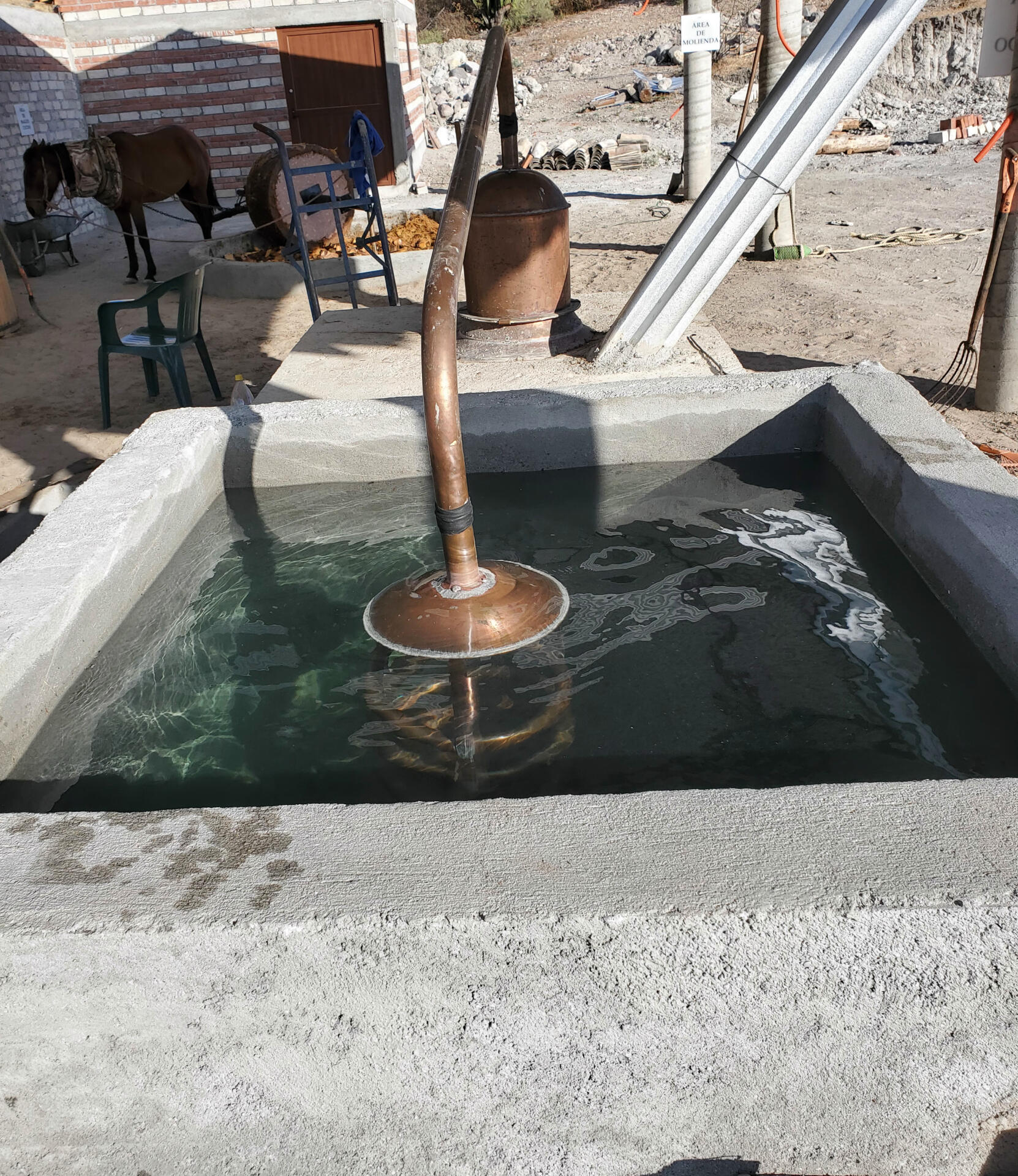 La pulpa fermentada es introducida a una olla de cobre. Ahí, el tepache habrá de hervir liberando así los vapores que se elevan, pasando al turbante, para después bajar al serpentín sumergido en agua fresca donde se condensarán para ser recibidos gota a gota en forma de mezcal.El producto obtenido aquí son puntas, cuerpo y colas y podrán ser destiladas las veces necesarias para obtener un mezcal de mayor calidad y más rico en alcoholes.