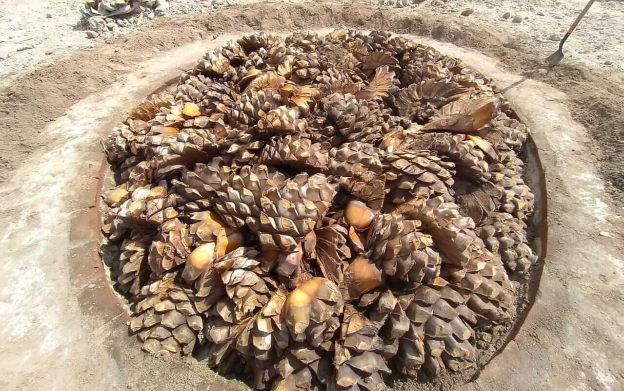 Las piñas seleccionadas son cocidas lentamente en un típico horno cónico de piedra durante aproximadamente cinco días, usando leña de maderas locales, preferentemente mezquite. A esta etapa se le conoce como “tapada”.